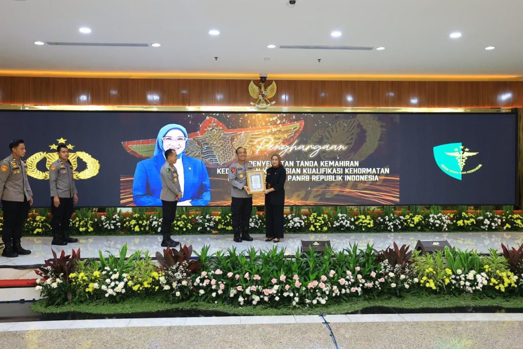 Sebagai bentuk penghargaan atas kontribusi terhadap pengembangan layanan kesehatan kepolisian, Polri turut menyematkan Tanda Kemahiran Kedokteran Kepolisian kepada Menteri PAN-RB Rini Widyantini.